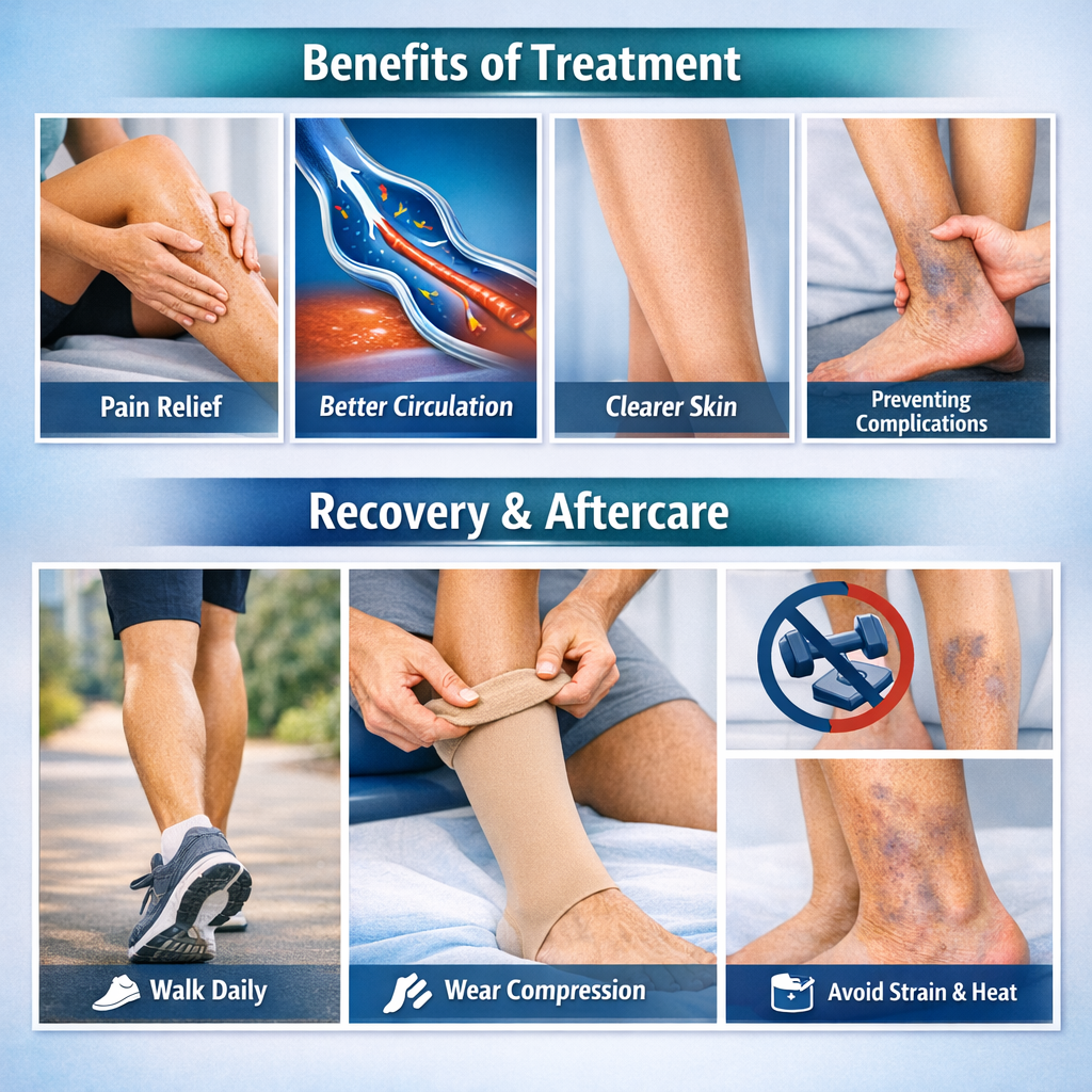 - Common Symptoms We Treat: Aching, heaviness, swelling, night cramps, restless legs, skin discoloration, itching, burning, and visible varicose or spider veins.